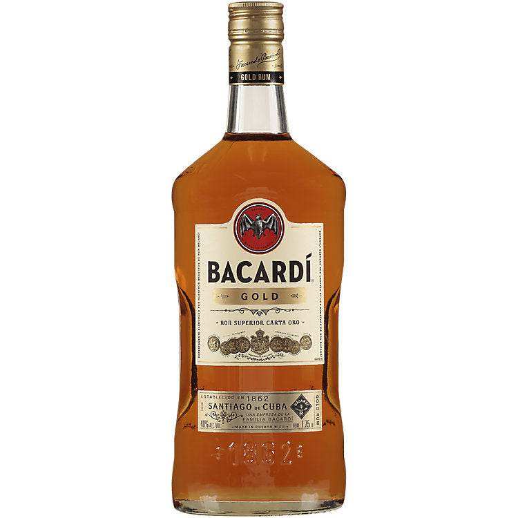 Bacardi Gold Rum 80 1.75 L bottle with rich amber hue.