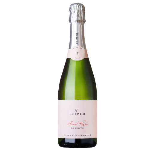 Loimer Extra Brut Reserve Rose 750ml sparkling wine bottle with elegant pink label and silver foil top.
