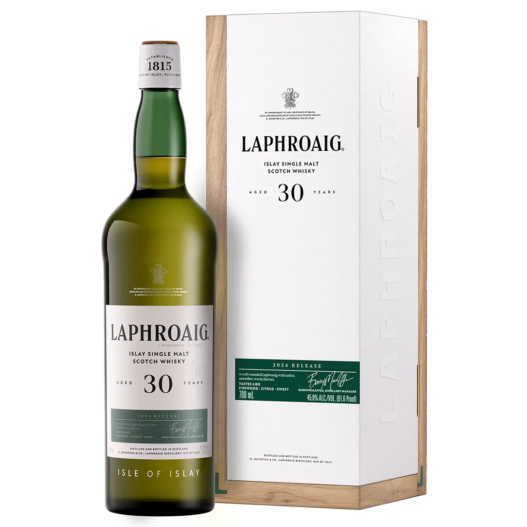The Laphroaig 30 Year Old Single Malt Scotch is an exceptional whisky, exhibiting complex flavors developed over three decades of maturation. On the nose, it offers deep, smoky peat aromas paired with rich vanilla, oak, and subtle hints of seaweed. The palate is full-bodied, with intense flavors of rich sherry, dried fruits, dark chocolate, and a delicate iodine touch, balanced by a smooth, long-lasting finish.